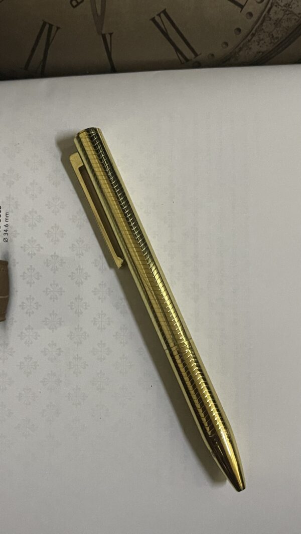 “قلم أنيق بتصميم كلاسيكي فاخر، مصنوع من المعدن عالي الجودة مع لمسات نهائية لامعة تضفي طابعًا راقيًا. يتميز بحجم متوسط ووزن متوازن، مما يجعله مثاليًا للانسياب بسهولة في جيب الكندورة أو البدلة دون أن يسبب أي إزعاج. يعمل بآلية سلسة قابلة للسحب، مما يضمن سهولة الاستخدام دون الحاجة إلى غطاء. طرف الكتابة الدقيق يوفر تجربة كتابة انسيابية واحترافية، ليكون رفيقك المثالي في المناسبات والاجتماعات.”