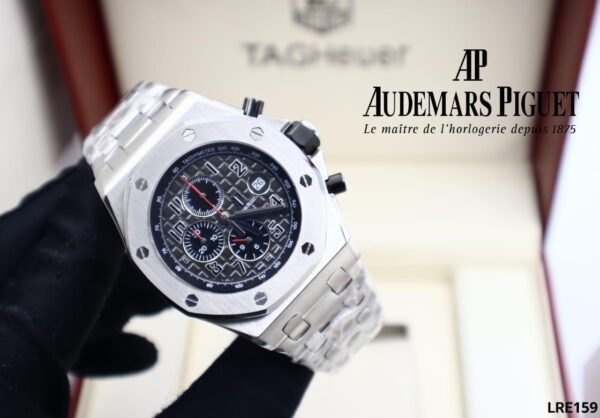 The Audemars Piguet Royal Oak Offshore 42mm replica features a distinctive dial with chronograph numbers and a stopwatch function. It offers complications such as date display, chronograph, and parts of the day, alongside hours, minutes, and seconds display. The watch is water-resistant and made from rust-resistant steel, with night illumination for easy reading in the dark.