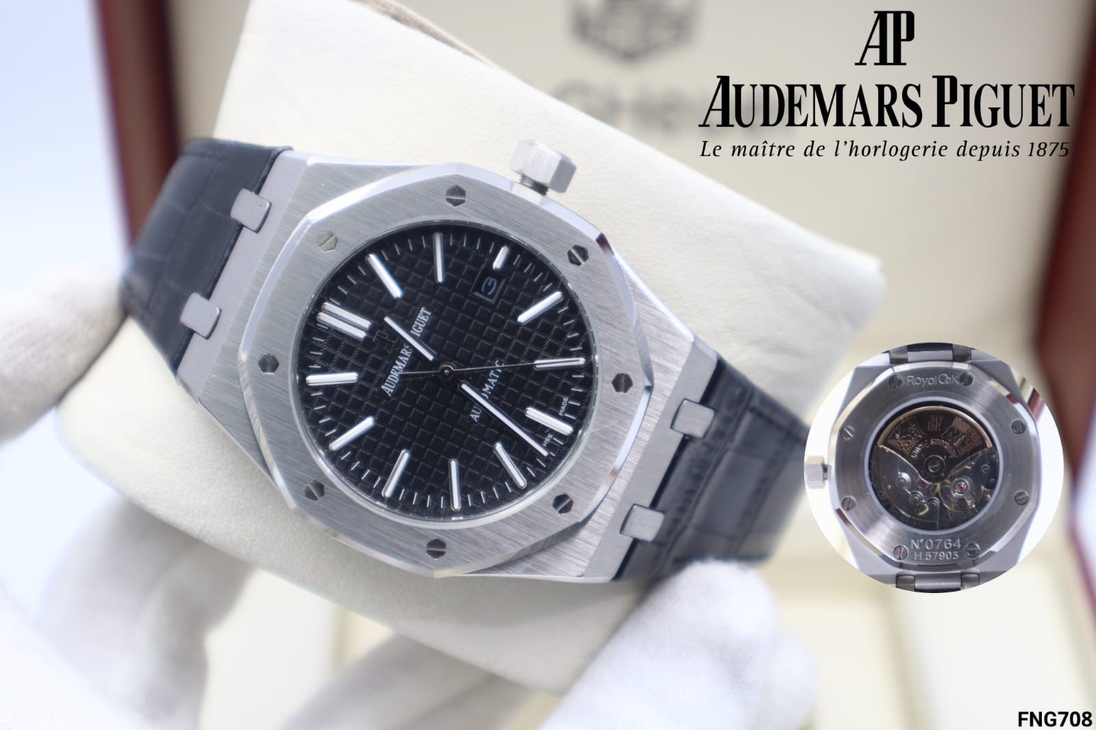 The Audemars Piguet Royal Oak watch features an open automatic movement with a 41mm diameter, blending luxury and performance seamlessly. Crafted with a durable stainless steel frame and a stylish leather strap with an Audemars clasp, it exudes elegance. The watch offers night illumination for easy reading in the dark, and its scratch-resistant sapphire glass adds durability. Available in four different options of colors and straps to suit various tastes. The set includes a box and a pouch, and the watch is water-resistant for everyday wear. It also comes with a one-year service warranty on the movement. This is a high-quality replica.