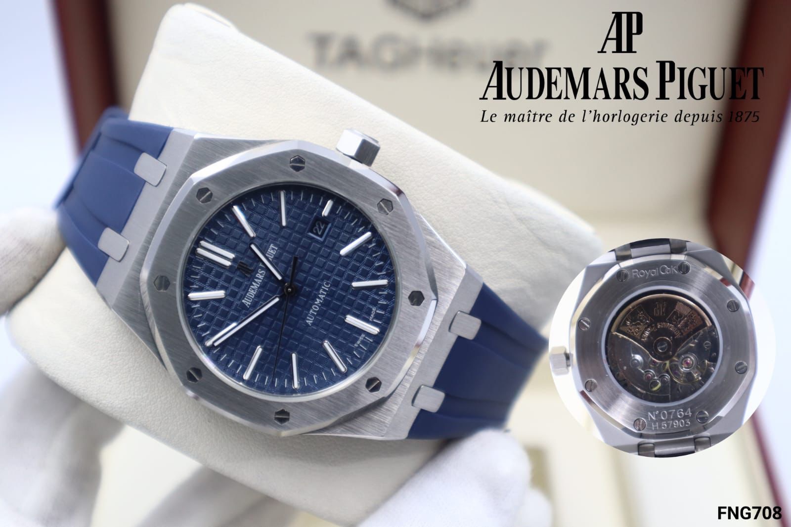 The Audemars Piguet Royal Oak watch features an open automatic movement with a 41mm diameter, blending luxury and performance seamlessly. Crafted with a durable stainless steel frame and a stylish leather strap with an Audemars clasp, it exudes elegance. The watch offers night illumination for easy reading in the dark, and its scratch-resistant sapphire glass adds durability. Available in four different options of colors and straps to suit various tastes. The set includes a box and a pouch, and the watch is water-resistant for everyday wear. It also comes with a one-year service warranty on the movement. This is a high-quality replica.