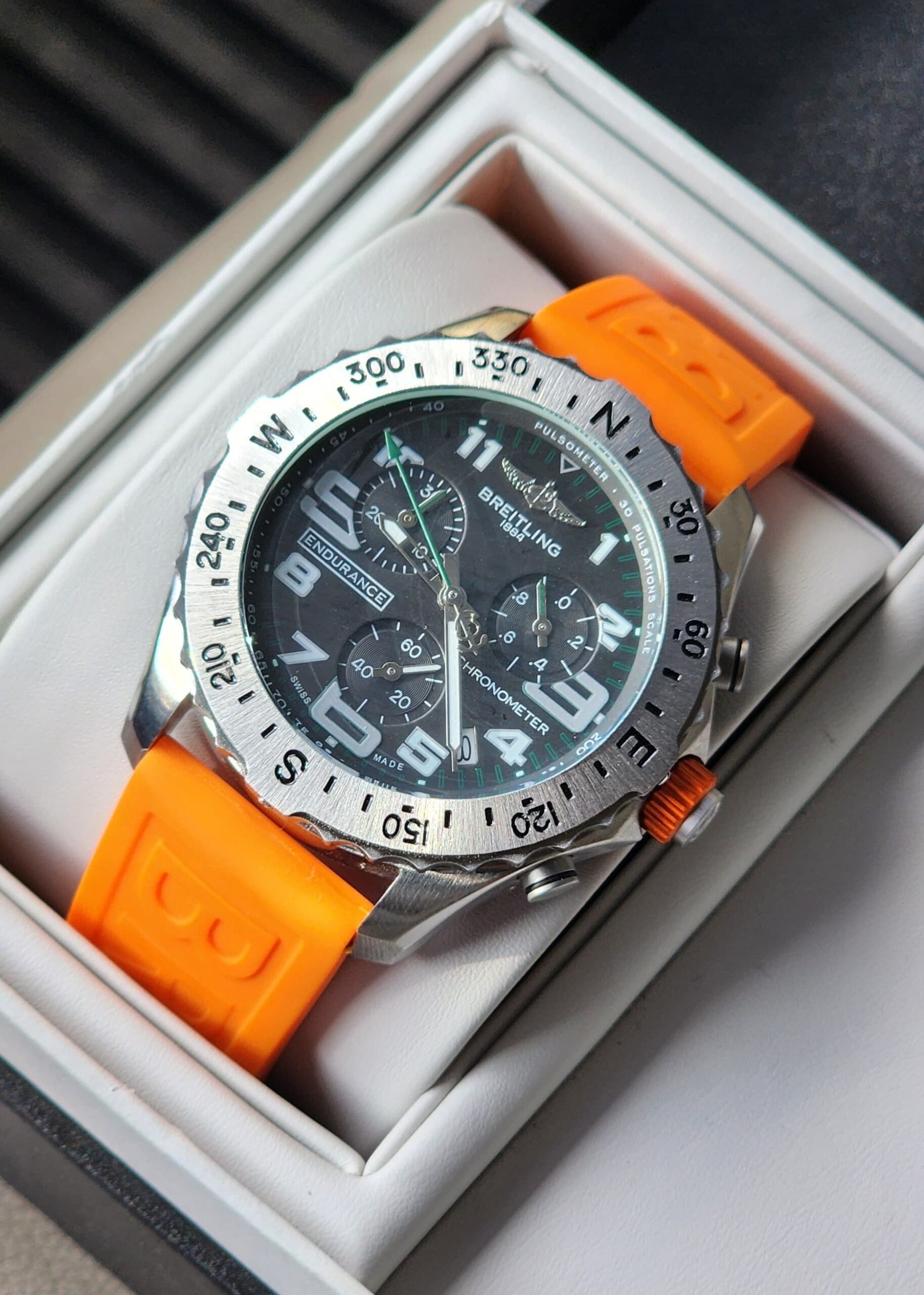 Be the first to review “Breitlight Endurance Grey dial with silver bezel and orange FKM strap Replica”