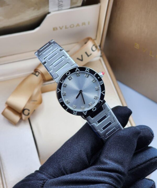 A luxurious ladies’ watch with an iconic Bulgari Sunburst Polished design, measuring 33mm, perfect for a delicate wrist. Features clear and elegant date, hour, and minute functions.