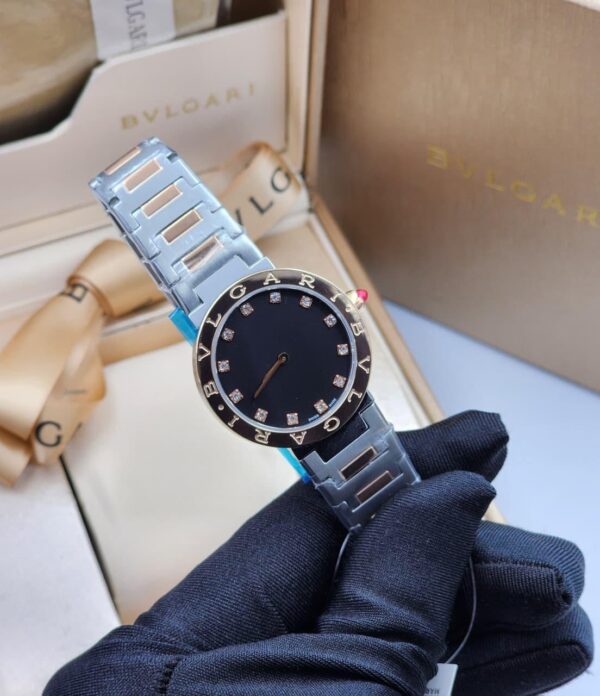 A luxurious ladies’ watch with an iconic Bulgari Sunburst Polished design, measuring 33mm, perfect for a delicate wrist. Features clear and elegant date, hour, and minute functions.