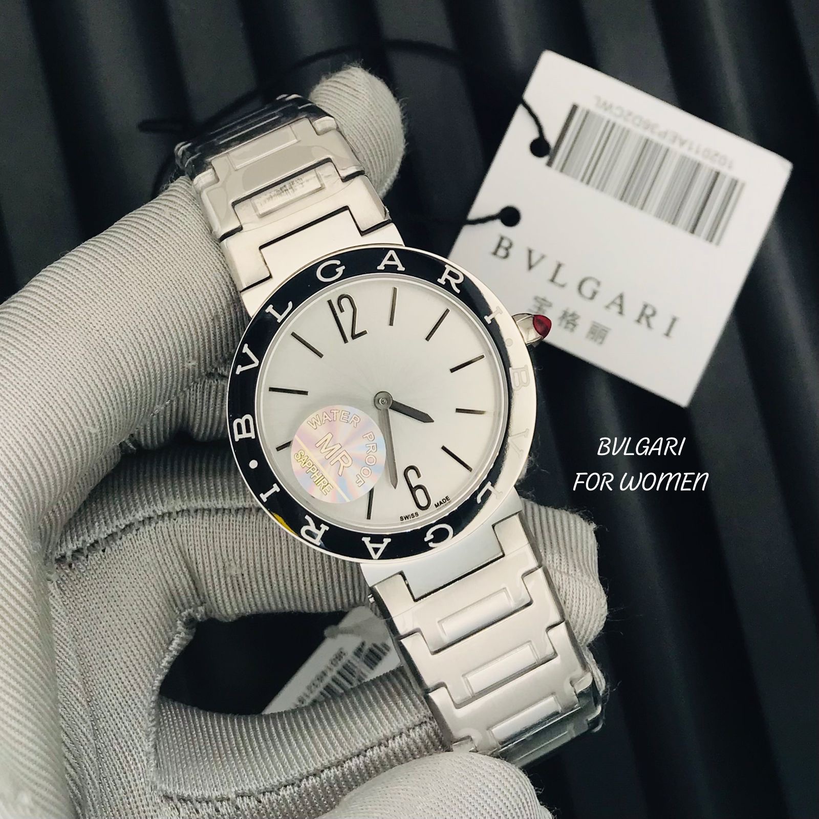 ساعة بولغاري نسائية تقليد فاخرة بقطر 33 ملم من الفولاذ المقاوم للصدأ، تأتي بإطار مزين بشعار بولغاري الأيقوني وتاج من الفولاذ المقاوم للصدأ مرصع بحجر صناعي أحمر. السوار مزين بشعار بولغاري، مما يضفي لمسة من الأناقة والرقي.
