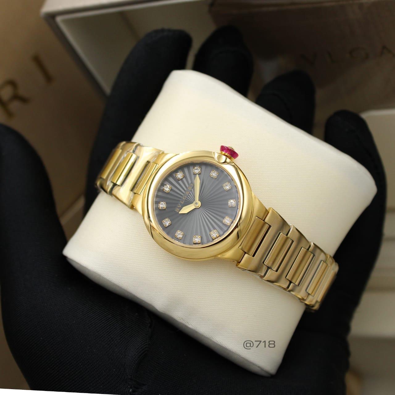 The Bvlgari Lvcea features a round case made of polished stainless steel with sapphire glass and is water-resistant. It has a quartz movement. The watch includes a box and pouch.