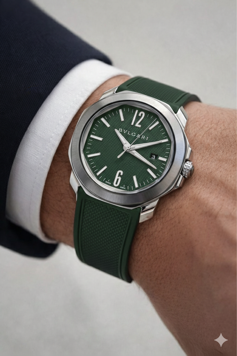 Elevate your style with the Bvlgari OCTO ROMA, a perfect blend of luxury and precision engineering. This watch comes with a sculpted FKM rubber strap, intricately patterned to enhance its visual appeal, and a sleek stainless steel case for a refined wrist presence.