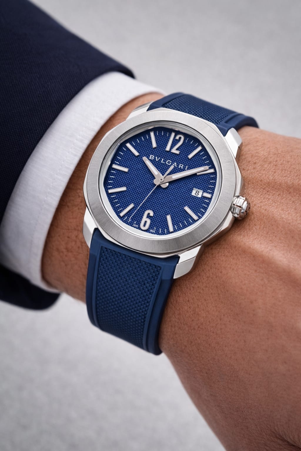 Elevate your style with the Bvlgari OCTO ROMA, a perfect blend of luxury and precision engineering. This watch comes with a sculpted FKM rubber strap, intricately patterned to enhance its visual appeal, and a sleek stainless steel case for a refined wrist presence.