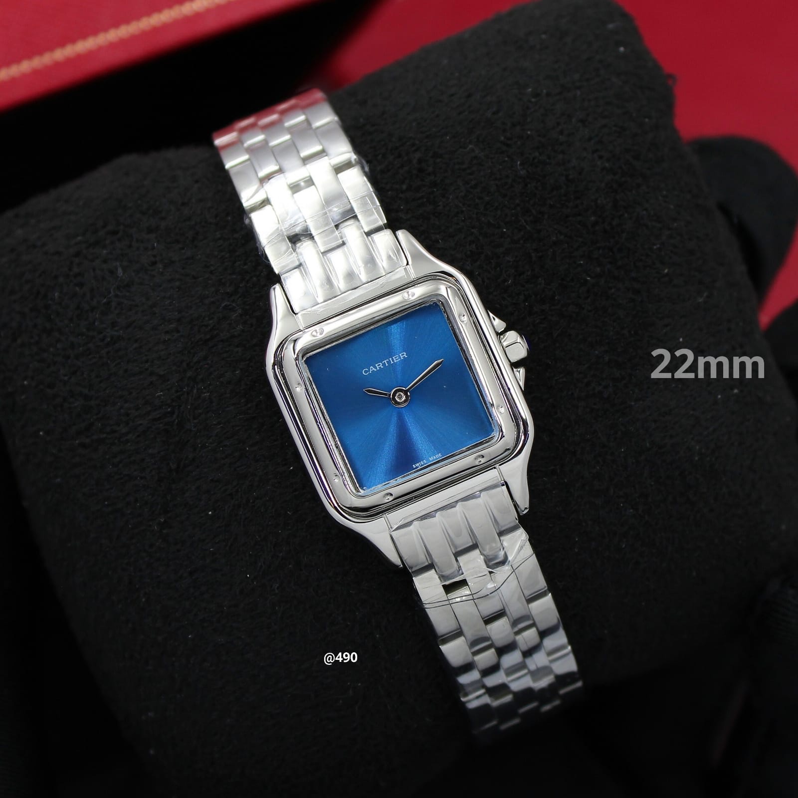 تأتي ساعة كارتير بانثر سمول الفاخرة هذه بحجم 22 ملم، ما يوفر حجمًا مصقولًا وأنيقًا. العلبة مصنوعة من ستيل 904L الذي يتميز بمقاومته العالية للتآكل ولمعانه البراق الذي يحاكي بشكل كبير مظهر الذهب الأبيض.