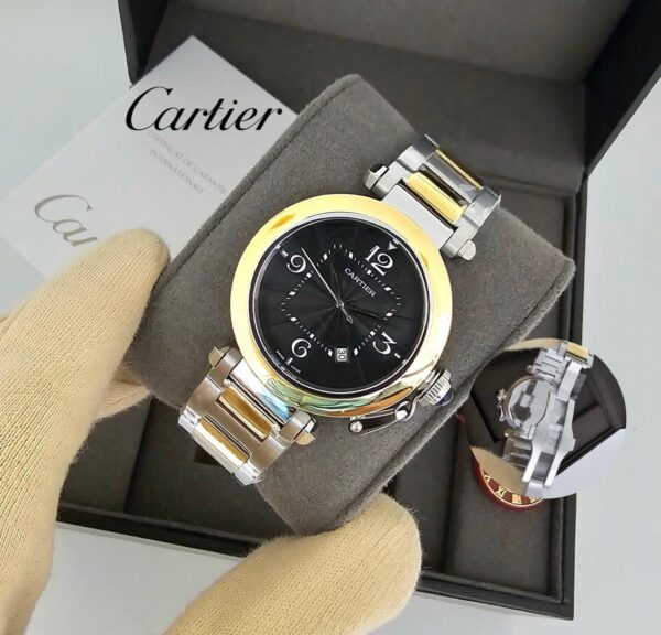 A unique and elegant 38mm timepiece, the Cartier Pasha features a striking round design with a dial displaying distinct numerals, combined with an eye-catching square case, setting it apart from all conventional designs. This watch stands out with its unusual yet beautiful blend of shapes, offering a sophisticated and modern twist on classic watchmaking.