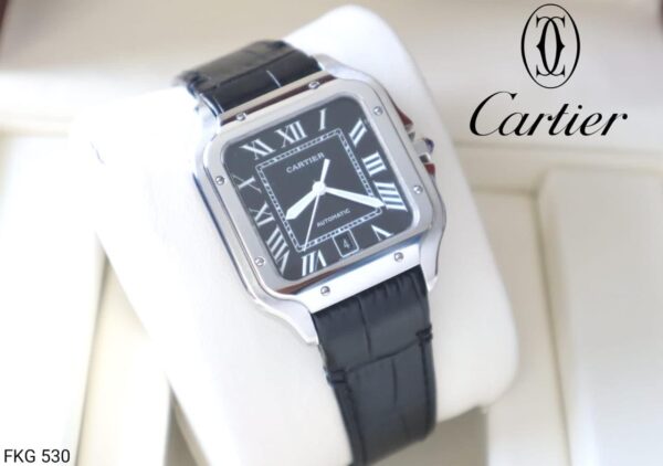 Santos de Cartier watch, a large model, manufactures mechanical movement with automatic winding. Steel case, ADLC bezel, steel crown set with a faceted black synthetic spinel,steel sword-shaped hands with luminescent material, sapphire crystal. Buy CARTIER SANTOS Replica