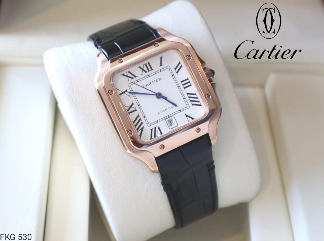 Cartier Santos، white dial and rose gold bezel black leather strap