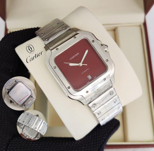 Santos de Cartier watch, a large model, manufactures mechanical movement with automatic winding. Steel case, ADLC bezel, steel crown set with a faceted black synthetic spinel,steel sword-shaped hands with luminescent material, sapphire crystal. Buy CARTIER SANTOS Replica.