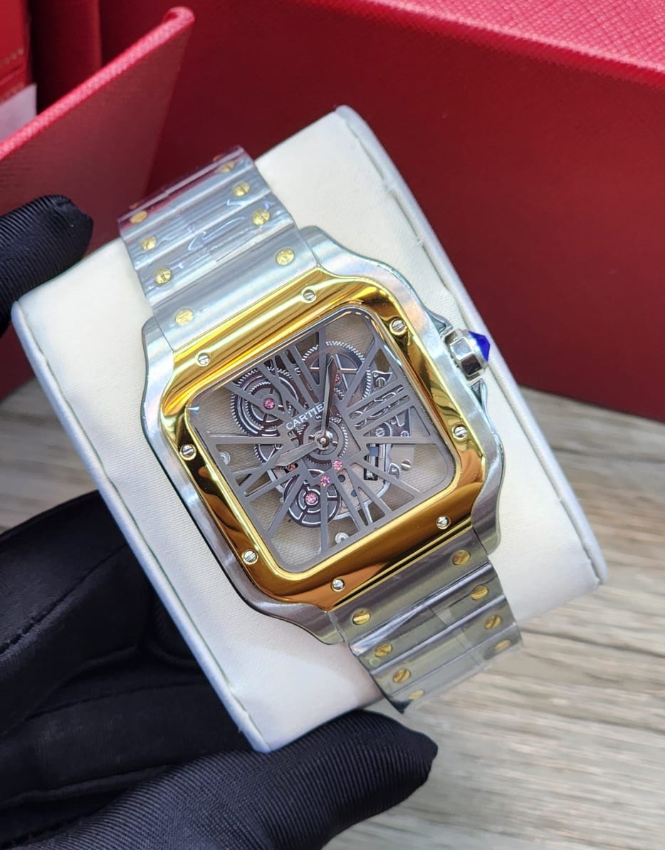 Cartier Santos, silver skeleton dial and gold bezel tow tone Perselect
