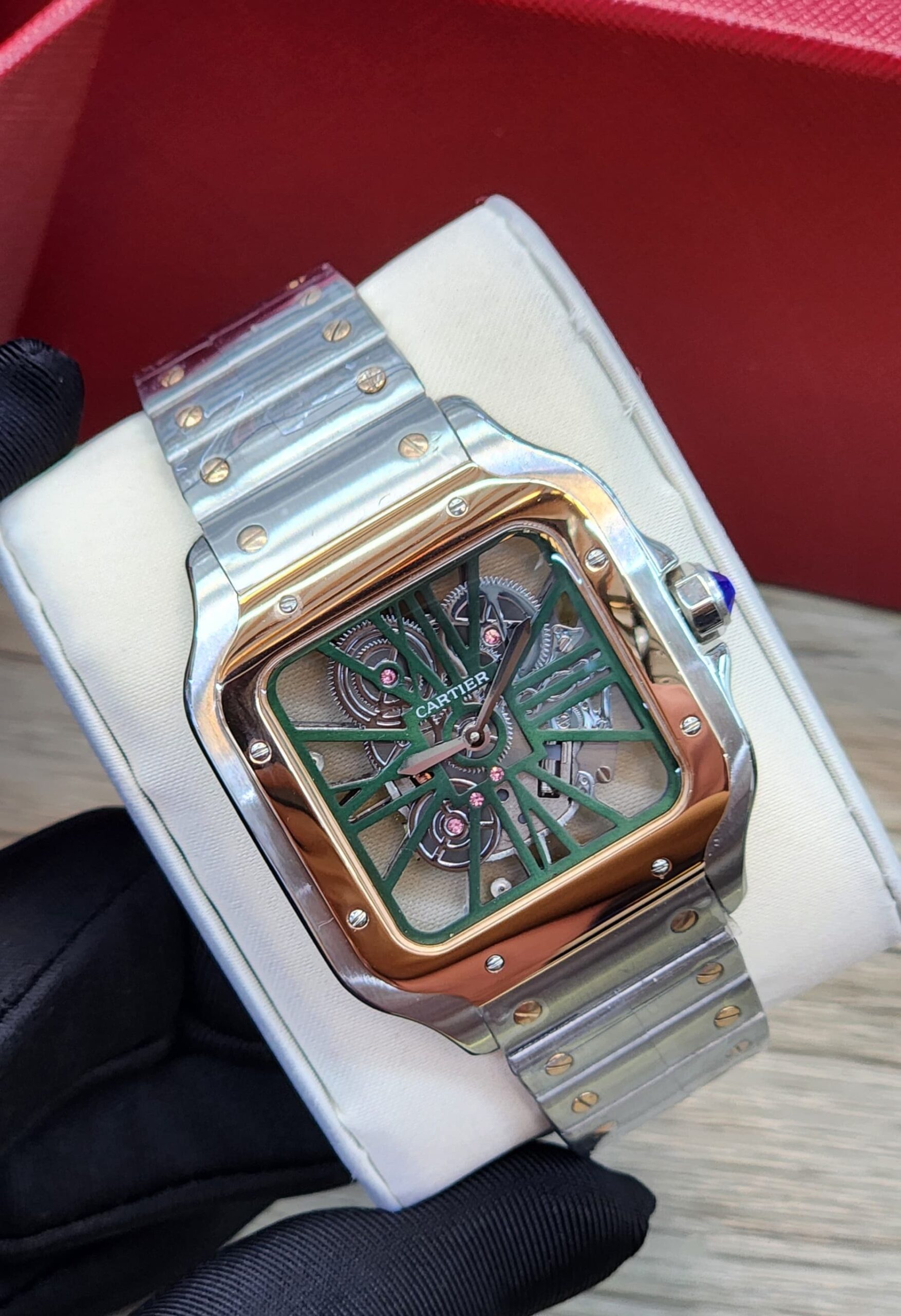 Be the first to review “Cartier Santos, green skeleton dial and Rose gold bezel Silver Perselect”