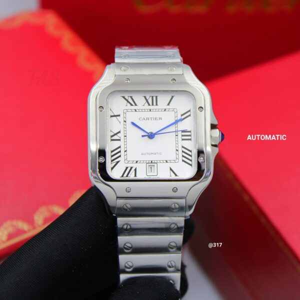Santos de Cartier watch, a large model, manufactures mechanical movement with automatic winding. Steel case, ADLC bezel, steel crown set with a faceted black synthetic spinel,steel sword-shaped hands with luminescent material, sapphire crystal. Buy CARTIER SANTOS Replica.