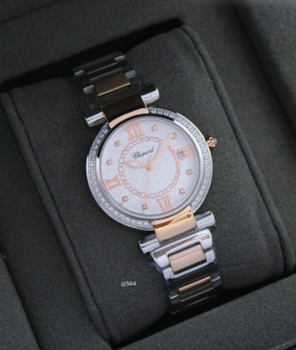 تأتي ساعة **Chopard Imperiale Quartz** بأرقام رومانية وتعتبر تقويم كامل بوظائف تتضمن التاريخ، اليوم، الساعات، الدقائق، والثواني. وتتميز بطوق داخلي مرصع بالأحجار.