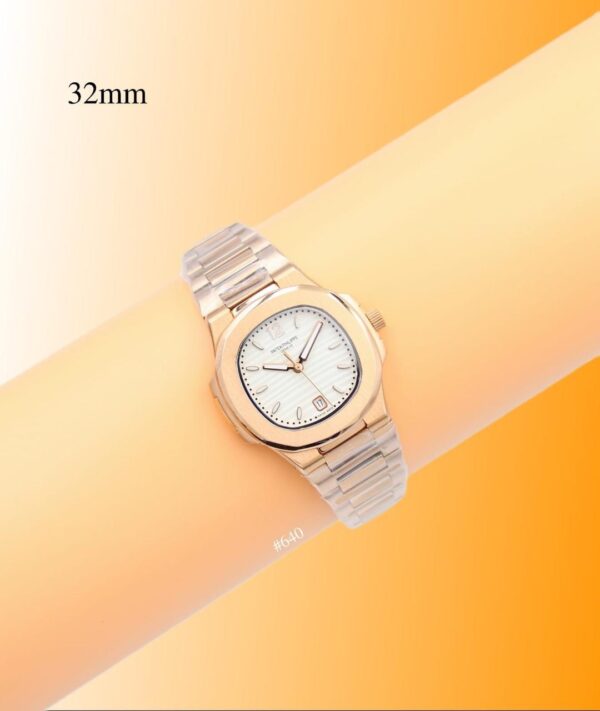 This watch features a luxurious design that combines classic sophistication with modern style, and is a precise replica of one of the most iconic Patek Philippe Nautilus designs. With a case diameter of 32 mm, it is ideal for adding a touch of elegance to your wrist. This size is suitable for everyone and gives the watch a stylish and comfortable appearance on various wrist sizes. It combines refined design with durability, thanks to the precisely crafted steel bracelet, adding a modern and attractive touch suitable for all occasions.