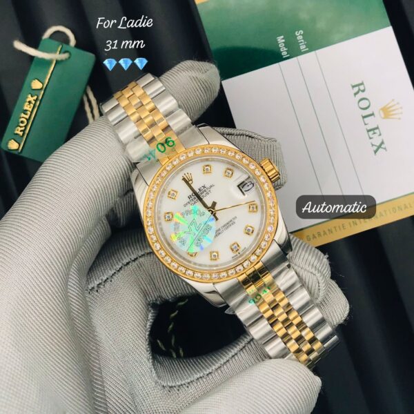 Shine with a luxurious look with the Rolex Datejust (REPLICA) women’s watch, combining elegance and high quality. This watch comes with a 31mm case and features sapphire glass for added protection and brilliance.