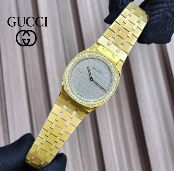 Shine with the luxurious **Gucci women’s watch** that combines elegance and high quality. This watch is adorned with sparkling **zircon stones**, adding a touch of glamour to your look. Crafted with precision as a **replica**, it caters to the refined taste of luxury lovers. The watch is made from **stainless steel**, resistant to rust for durability, and is **water-resistant**, making it perfect for a modern lifestyle. It features **quartz movement technology**, known for its high accuracy. With a **30mm** diameter, this watch is ideal for elegant looks on any occasion.