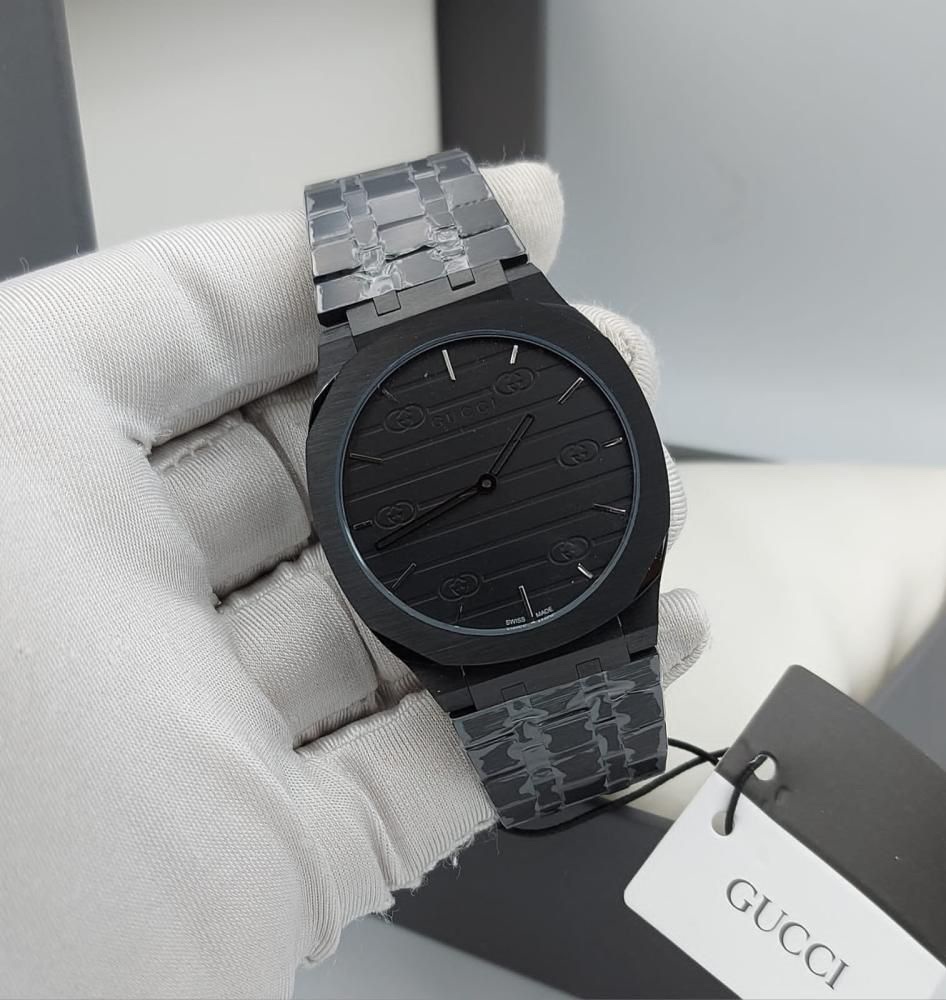 The Gucci 25H (Replica) watch combines Italian luxury with modern design. The full black dial with distinctive Gucci logo engravings makes this watch a unique piece that stands out on any occasion. Whether you’re looking for a watch to complement your daily outfit or a piece that adds a touch of luxury to special looks, this watch offers you the perfect blend of style and quality at an affordable price.