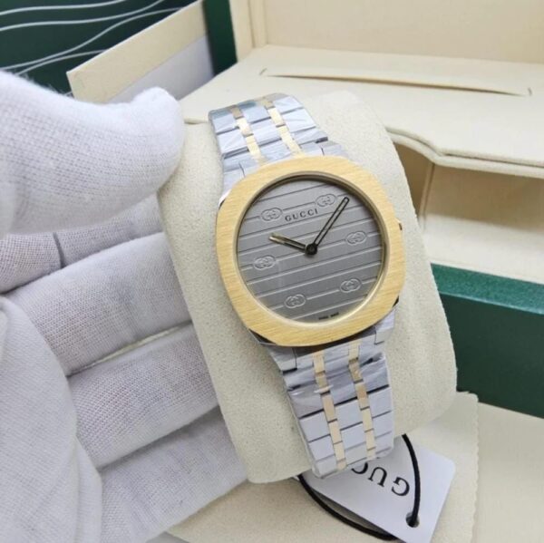 The Gucci 25H (Replica) watch combines Italian luxury with modern design. The full gray dial with distinctive Gucci logo engravings and gold hands adds a unique touch that stands out on any occasion. Additionally, the gold-plated case and the two-tone gold and silver bracelet add a touch of luxury and distinction. Whether you’re looking for a watch to complement your daily outfit or a piece that adds a touch of elegance to special looks, this watch offers the perfect blend of style and quality at an affordable price.