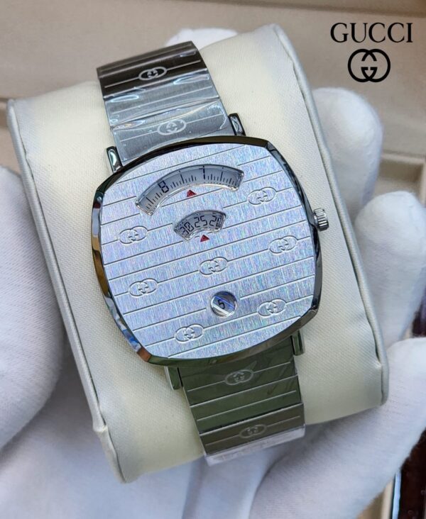 “REPLICA Gucci Grip YA157403 is a luxurious piece combining modern design with elegance. The watch features a 40mm case made of steel, with a decorated dial showcasing the Gucci logo and distinctive patterns. It stands out with its unconventional design in the world of watches, featuring a square case and an unusual appearance. The integrated metal bracelet is adorned with engraved Gucci logos, adding a unique touch of sophistication. Additionally, it includes a moon phase indicator and is water-resistant, making it ideal for everyday use. The watch comes with an elegant box and pouch and includes a full one-year warranty covering functionality, color, and movement.”