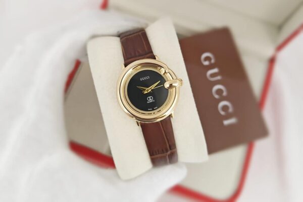 The women’s Gucci watch is a luxurious piece that combines elegance with functionality. This REPLICA watch features a 31mm case, a glossy leather strap, and a dial adorned with the Gucci logo on the inside, with a shiny chrome bezel. It includes functions for hours, minutes, and seconds, and is water-resistant for daily use. The watch comes with a box and a pouch, operates with a quartz movement, and includes a one-year maintenance warranty.