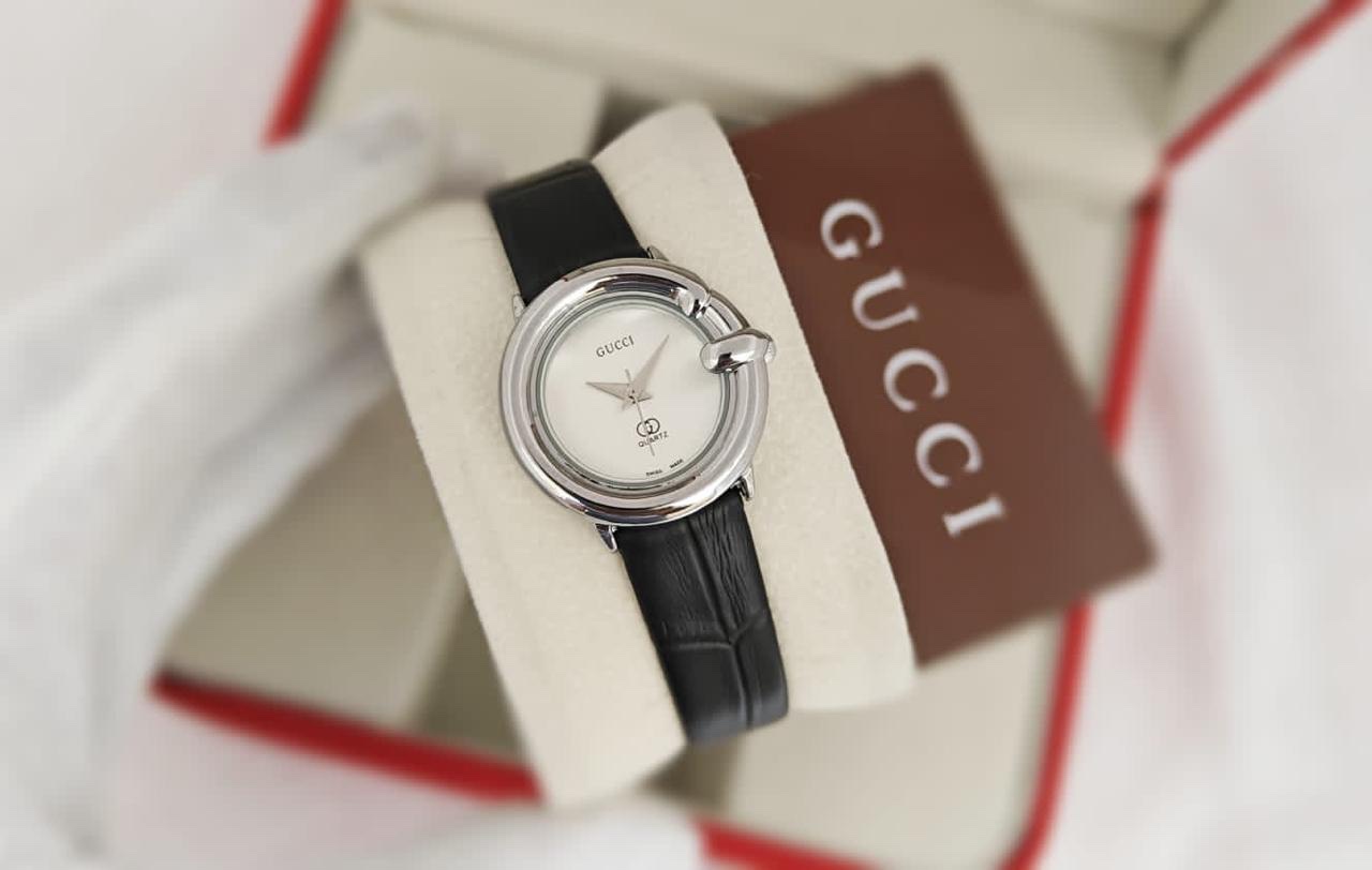 The women’s Gucci watch is a luxurious piece that combines elegance with functionality. This REPLICA watch features a 31mm case, a glossy leather strap, and a dial adorned with the Gucci logo on the inside, with a shiny chrome bezel. It includes functions for hours, minutes, and seconds, and is water-resistant for daily use. The watch comes with a box and a pouch, operates with a quartz movement, and includes a one-year maintenance warranty.