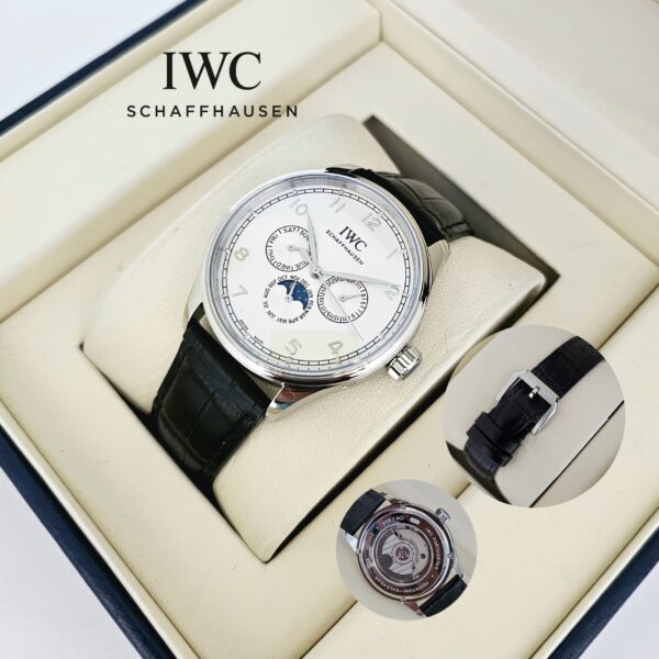 The IWC Portugieser Automatic Chronograph 41mm is a perfect blend of timeless elegance and exceptional craftsmanship. Featuring a soft leather strap for ultimate comfort and style, this watch is designed with a dual chronograph and perpetual calendar (Perpetual Calendar) function, allowing you to measure time with precision and track the day, date, month, and even phases of day and night seamlessly.