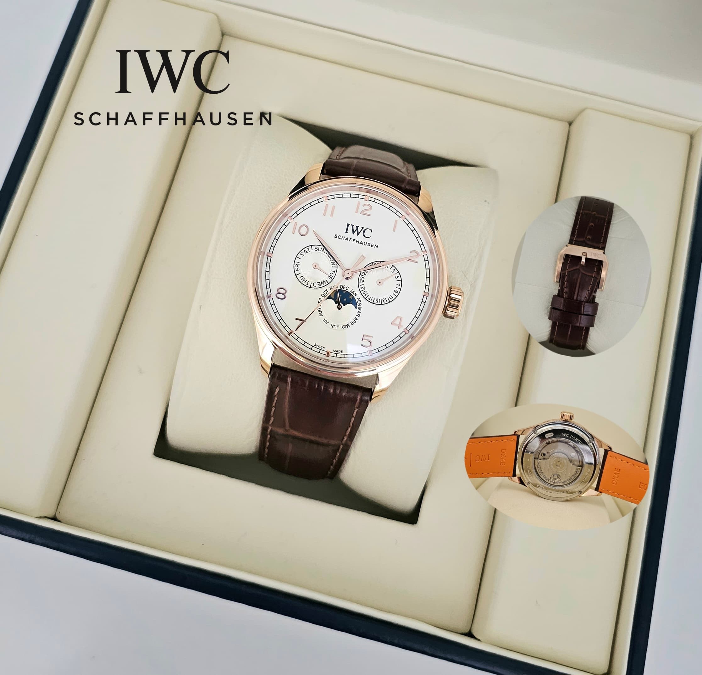 The IWC Portugieser Automatic Chronograph 41mm is a perfect blend of timeless elegance and exceptional craftsmanship. Featuring a soft leather strap for ultimate comfort and style, this watch is designed with a dual chronograph and perpetual calendar (Perpetual Calendar) function, allowing you to measure time with precision and track the day, date, month, and even phases of day and night seamlessly.