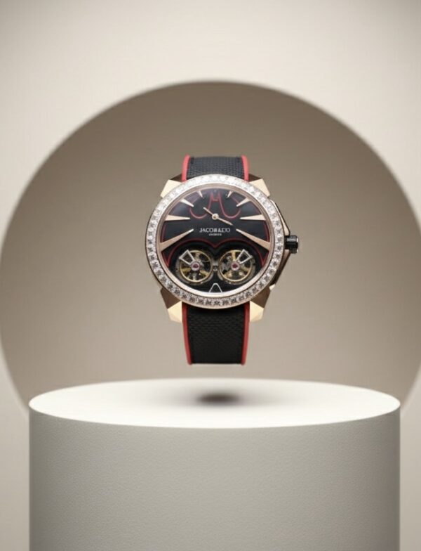 ساعة ميكانيكية متقدمة مزودة بـ توربيون ثنائي (Dual Tourbillon) يساهم في تحسين دقة الحركة وتقليل تأثير الجاذبية، مع مكينة مفتوحة بالكامل (Skeleton Movement) تتيح مشاهدة أداء التروس والتوربيون بشكل مباشر أثناء التشغيل، مع طوق أحجار موزانيت.