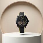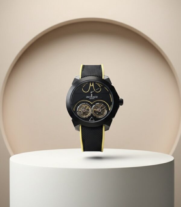 An advanced mechanical watch featuring a Dual Tourbillon, designed to enhance movement accuracy and reduce the effects of gravity. It comes with a fully skeletonized movement, allowing a clear view of the gears and tourbillon operation during use.