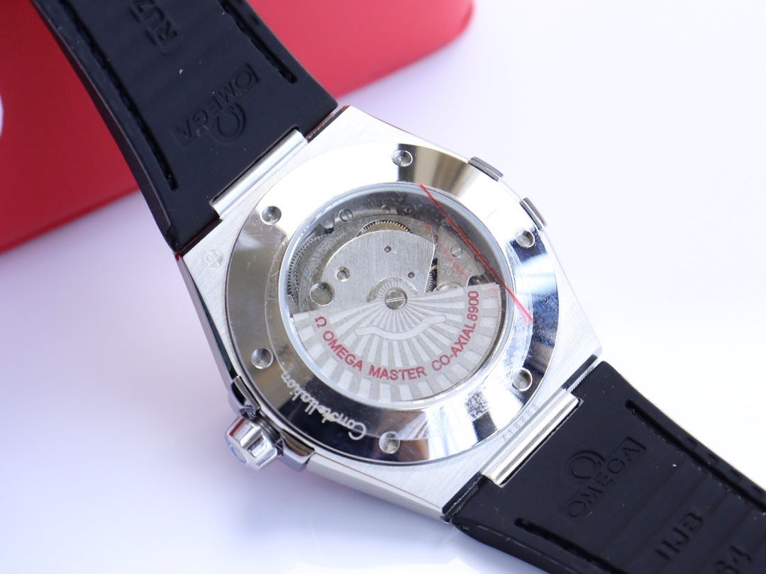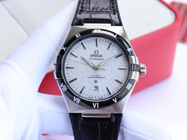 Omega Constellation white dial and Black Replica bezel,black leather replica
