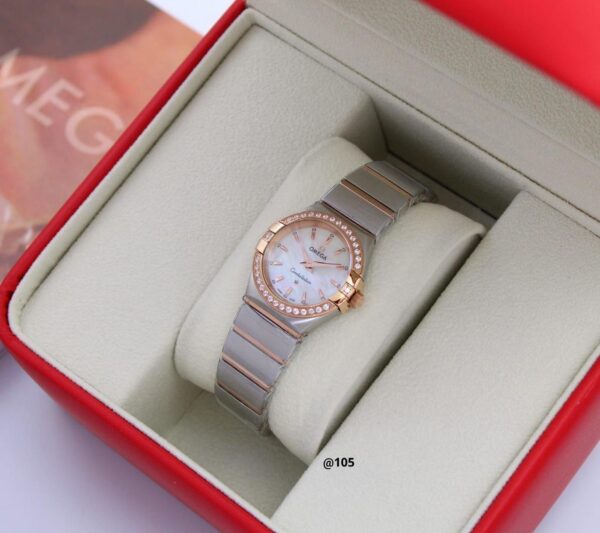 The OMEGA Constellation features a white mother-of-pearl dial and a scratch-resistant sapphire crystal. This model comes with a stainless steel bezel adorned with stones and is paired with a stainless steel bracelet. The watch measures 31 mm and is suitable for all occasions, whether daily wear, work, or events. It provides a comfortable fit on the wrist and has a beautiful size. This model comes with a warranty and is water-resistant. It also includes a box and pouch.