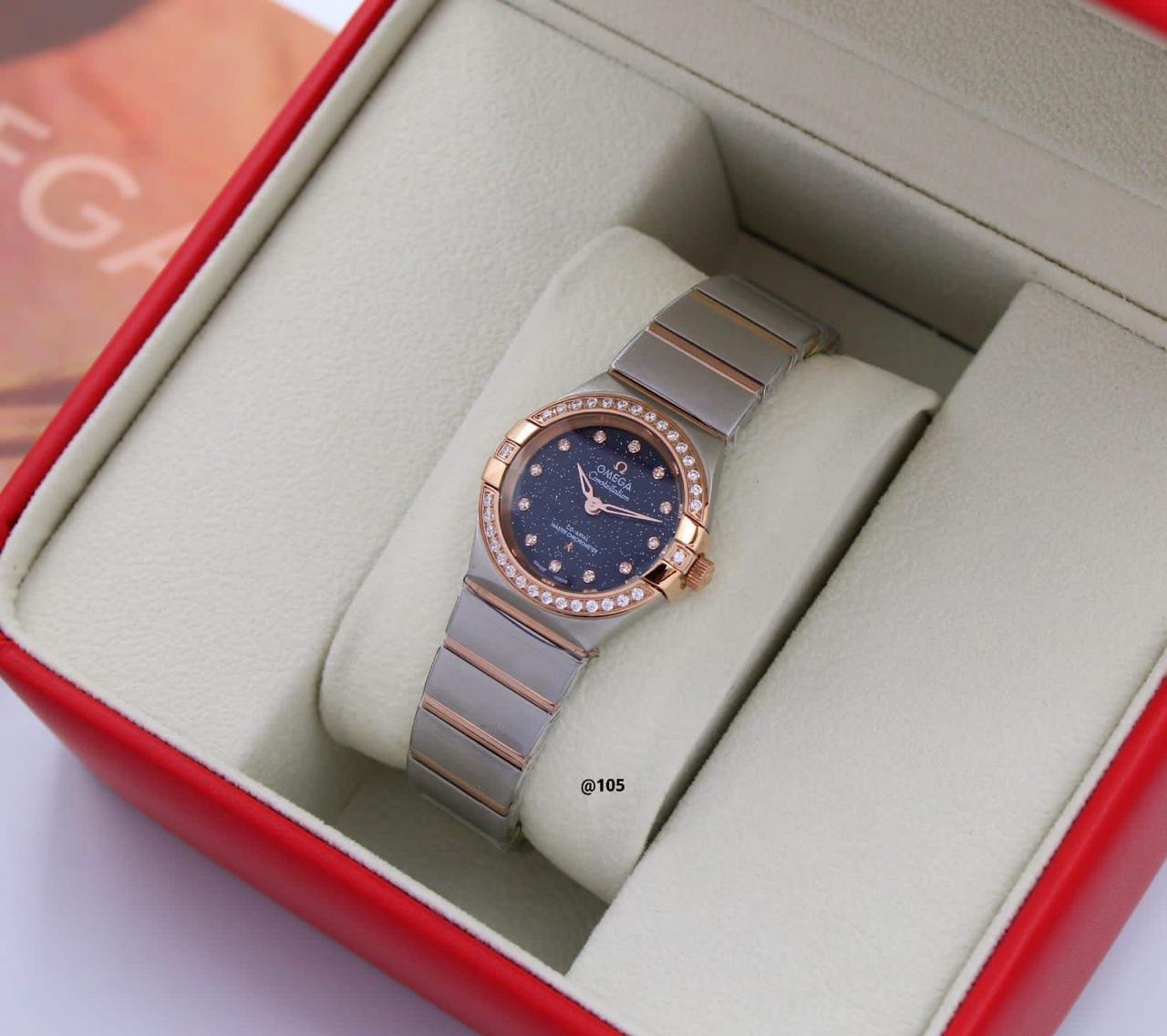 The OMEGA Constellation features a white mother-of-pearl dial and a scratch-resistant sapphire crystal. This model comes with a stainless steel bezel adorned with stones and numerals, and is paired with a stainless steel bracelet. The watch measures 31 mm and is suitable for all occasions, whether daily wear, work, or events. It provides a comfortable fit on the wrist and has a beautiful size. This model comes with a warranty and is water-resistant. It also includes a box and pouch.