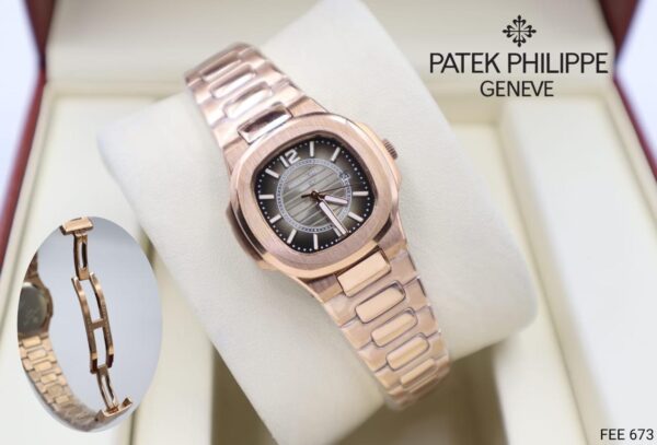 ساعة باتيك فيليب ناتيلوس، قياس 31 مم، هي قطعة فنية تجمع بين الأناقة والوظائف العملية. تتميز هذه الساعة بإطار داخلي يزيد من جمالية التصميم، مما يجعلها تبرز بين الموديلات الأخرى. السوار المعدني مصنوع من الستيل المقاوم للصدأ، مما يضمن لك المتانة والراحة في الاستخدام اليومي. تأتي الساعة بإضاءة ليلية عند الرقم 12، مع أحرف وأرقام مضيئة، مما يسهل قراءتها في الظلام. تشمل وظائف التعقيد عرض التاريخ والساعات والدقائق والثواني، بالإضافة إلى تقويم شامل. هي أيضاً مقاومة للماء، مما يجعلها مثالية للاستخدام في مختلف الظروف. تأتي مع ضمان كامل لمدة عام، مع كافة المرفقات الضرورية. هذه الساعة تقليد عالية الجودة تجسد روح التصميم الأصيل والأداء المتميز.
