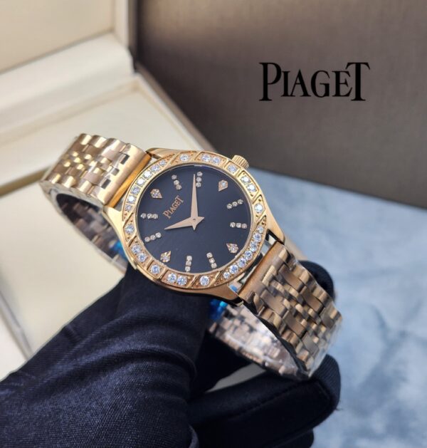 This elegant replicaPiaget women’s watch, measuring 31mm, features numerals adorned with synthetic stones, adding a touch of luxury. The bezel is decorated with sparkling stones for an added brilliance. The watch operates with a precise Quartz 301 movement, ensuring high accuracy.