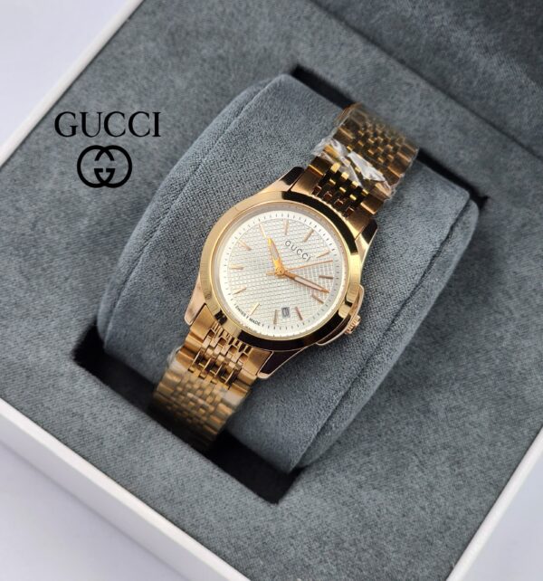 **REPLICA Gucci YA126410** is a stylish and sophisticated watch designed for women. It features a round 31mm stainless steel case, adding a touch of elegance. The watch comes with a metal band and displays time in an analog format. It is equipped with durable sapphire glass and is water-resistant, making it suitable for daily wear. The watch combines functionality with refined design and includes a full one-year warranty covering functionality, color, and movement. It comes in an elegant box and pouch.