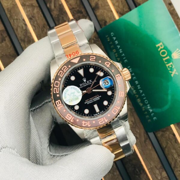 This watch is a high-quality replica of the Rolex GMT-Master II Root Beer “To-Twin,” featuring a sleek black dial and a rose gold and brown ceramic bezel, giving it a stylish and unique look. While not original, it retains the same luxurious design and functionality, making it an excellent choice for those seeking elegance and quality at an affordable price.