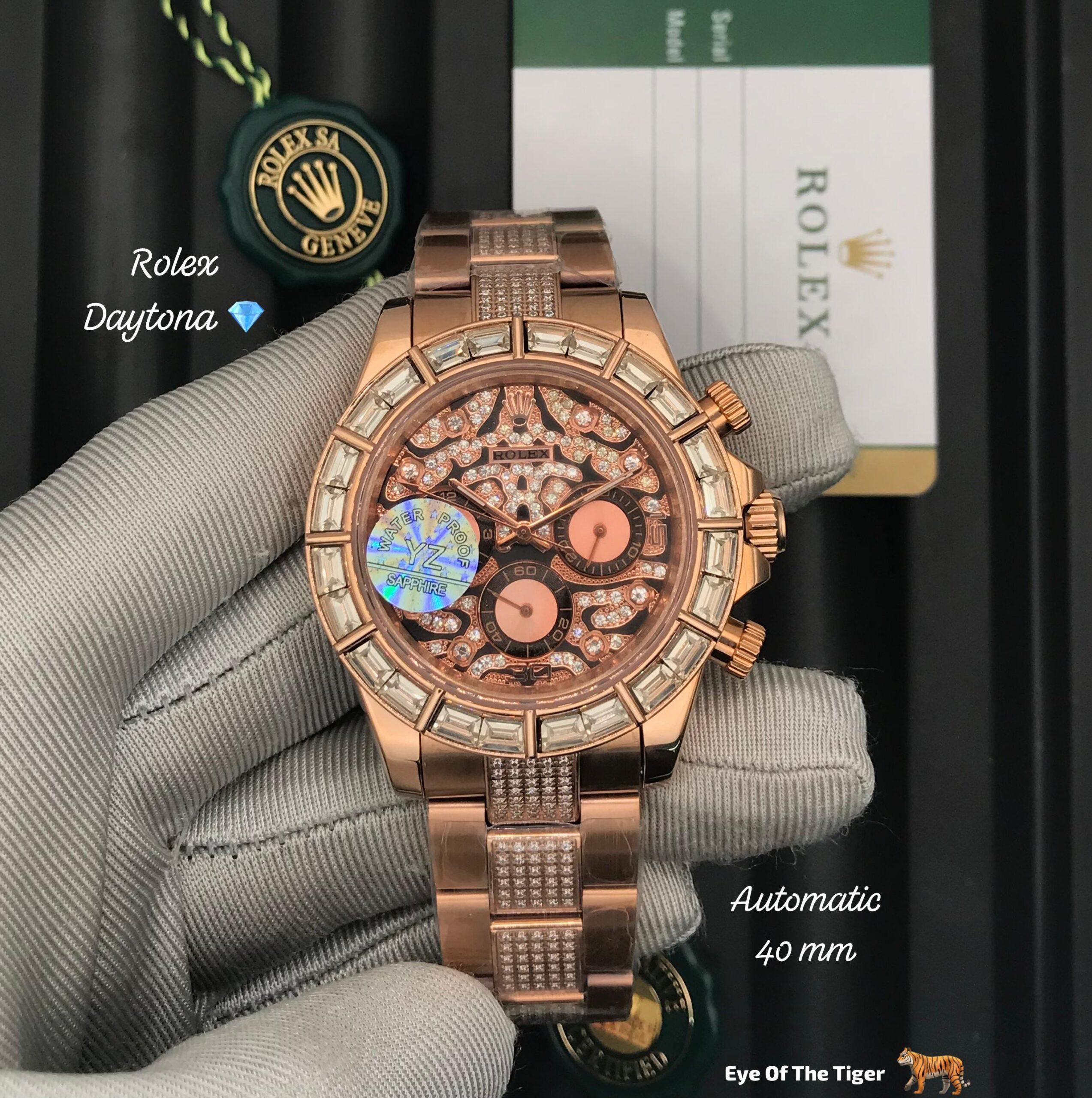 The “Rolex Daytona Tiger” watch is crafted from high-quality 904L stainless steel, making it resistant to rust and water, ensuring durability and practical use in all conditions. Fully adorned with sparkling stones that cover the bezel, dial, bracelet, and even the numbers, it adds a luxurious and radiant touch. The watch comes with a box and all accessories, and is a high-quality replica that offers the same elegance and fine details of the original Daytona watch.