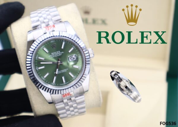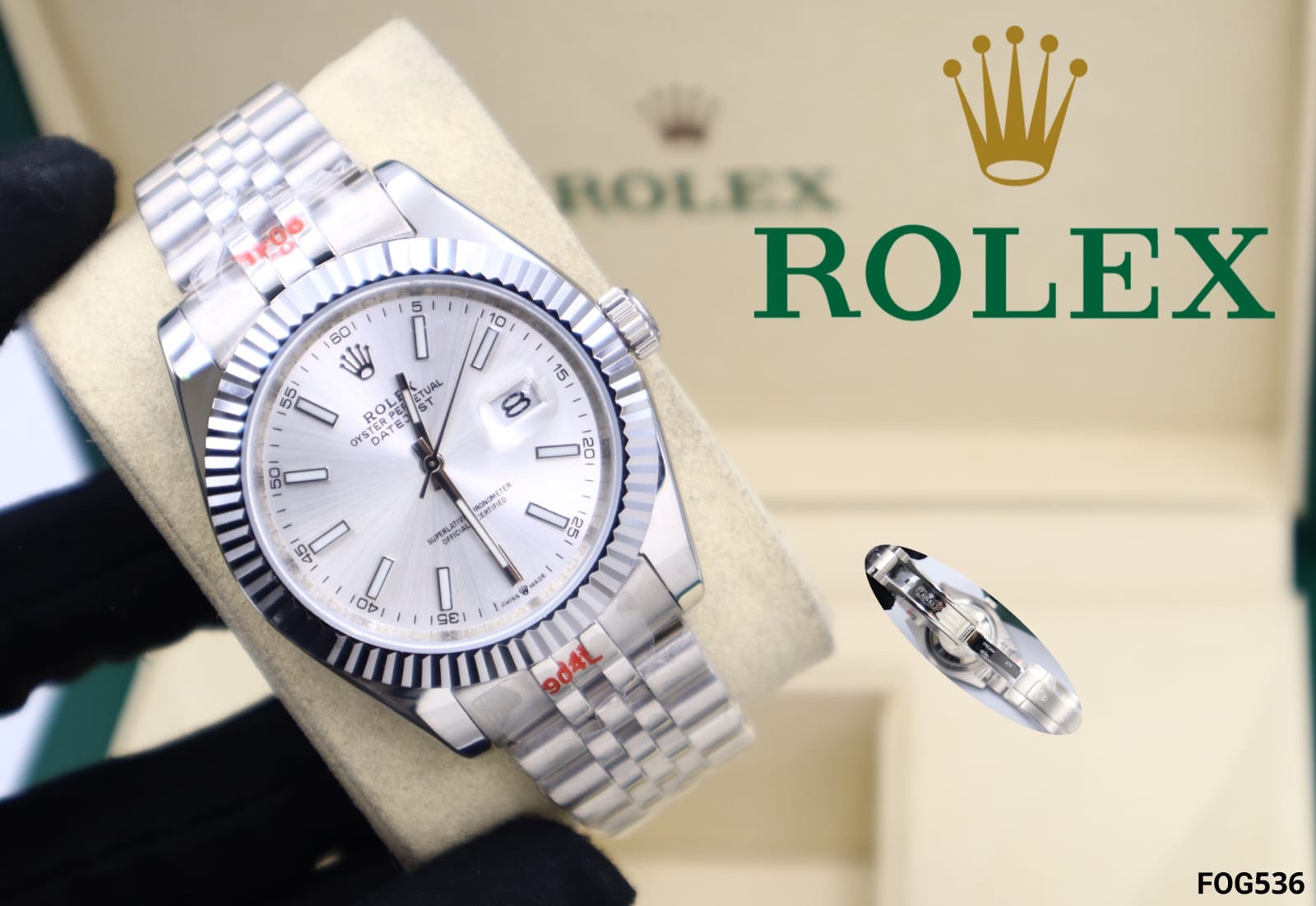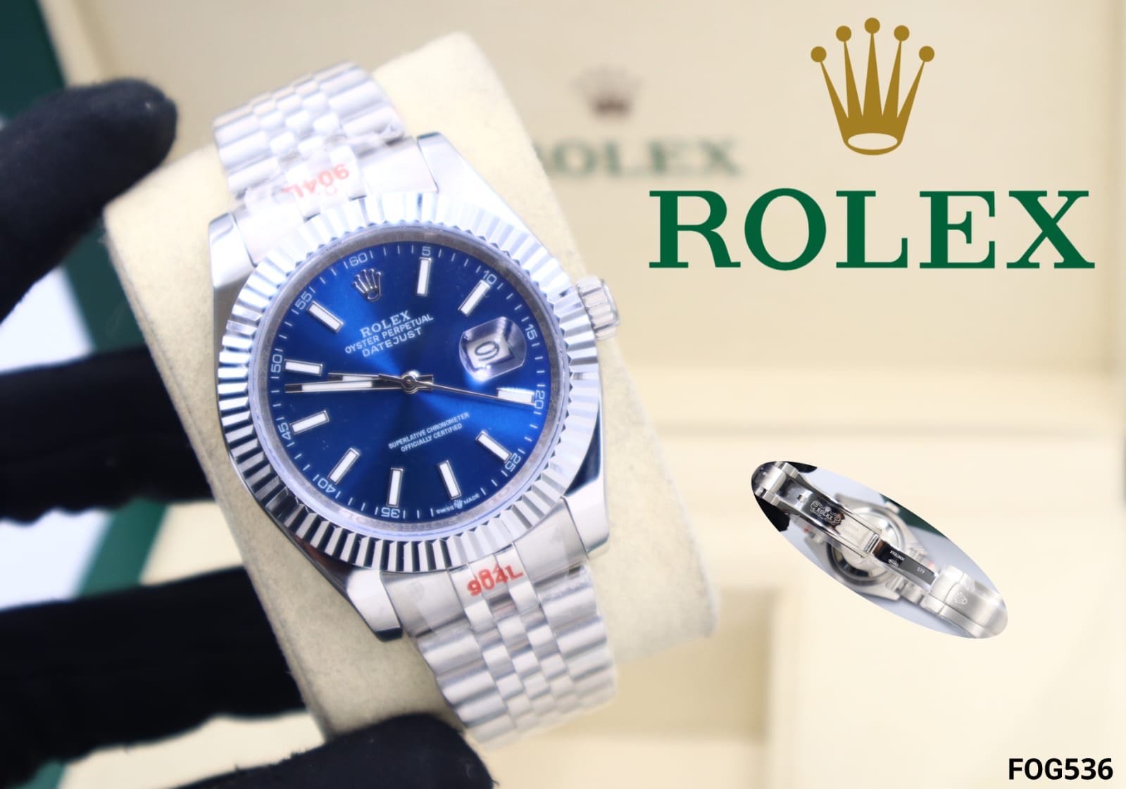 تتميز Rolex Datejust 41mm بتصميم فاخر مع مينا مزين بأشعة الشمس، مما يضفي لمعاناً جميلاً على الوجه. الإطار المخدد (fluted bezel) مصنوع من الفولاذ المقاوم للصدأ، مما يضيف لمسة أنيقة كلاسيكية. السوار من نوع Jubilee مصنوع من فولاذ 904L المعروف بمقاومته للصدأ والمتانة العالية.