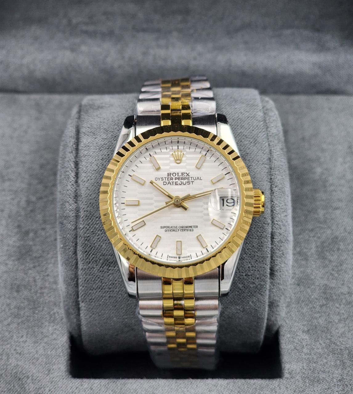 رولكس ديت جست تقليد، ساعة نسائية ناعمة بقياس 31 ملم، مصنوعة بدقة من ستيل 904L الفاخر المعروف بمقاومته العالية للتآكل والصدمات. تتميز الساعة بمينا أنيق بتصميم “Wave Dial” المتموج، الذي يضفي لمسة جمالية رائعة ويزيد من تألق الساعة، مما يجعلها اختياراً مثالياً للسيدات الباحثات عن الفخامة والتميز.