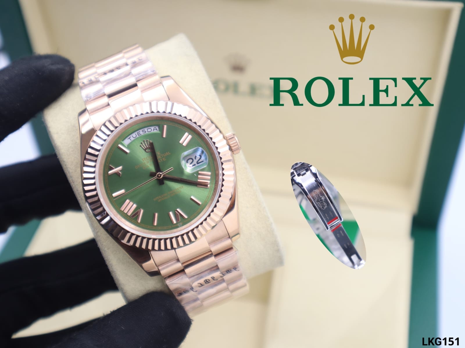 Be the first to review “ROLEX DAY-DATE, ROSE GOLD, GREEN DIAL ROMAN NUMERALS, REPLICA”