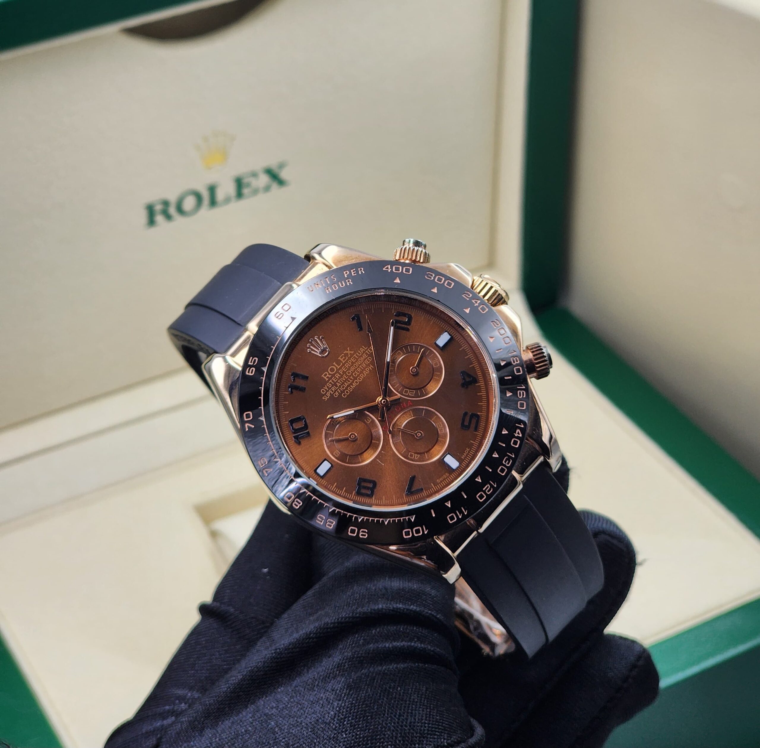 ROLEX DAYTONA COSMOGRAPH OYSTERFLEX REPLICA – CHOCOLATE DIAL & ROSE GOLD CASE WITH SPORTY NUMERALS