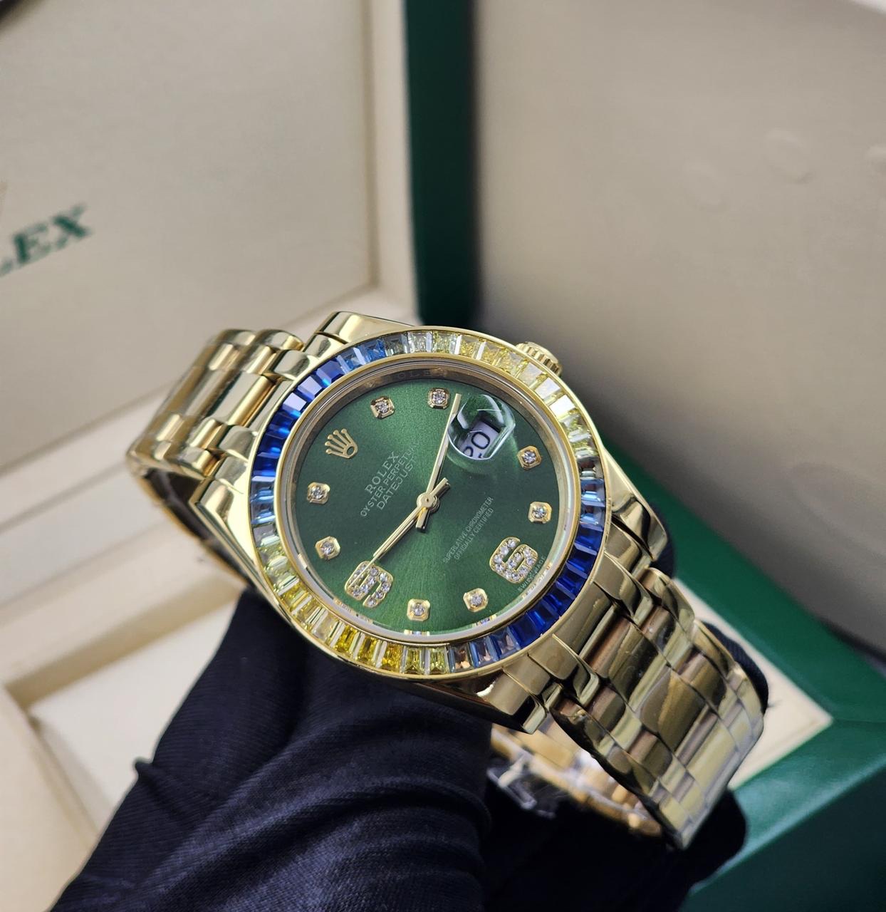 ساعة رائعة تجمع بين الأناقة والتميز، تتميز بطوق مزين بالأحجار الفاخرة، مما يضيف لمسة من الفخامة إلى تصميمها. تأتي هذه الساعة بمقاس 36 ملم، وهو حجم مثالي يناسب المعصم سواء للرجل أو المرأة.