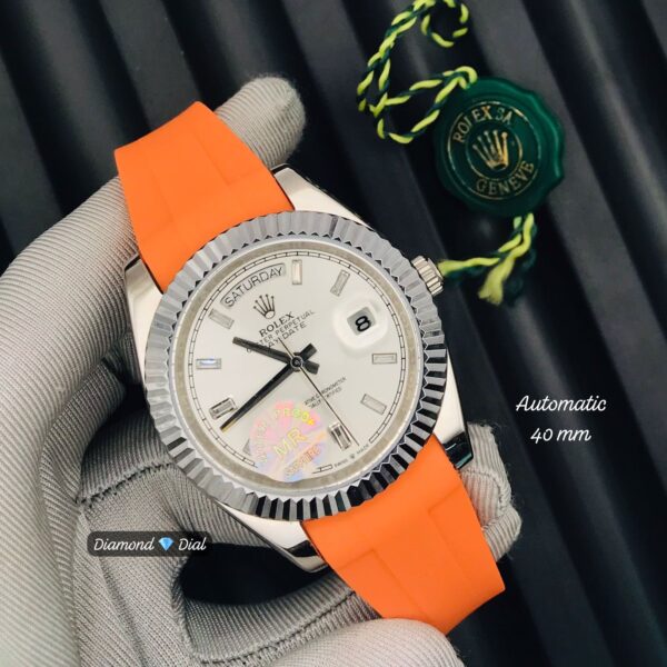 Rolex Day-Date,numerals,stone-set, silver dial,orange strap.Replica،40MM