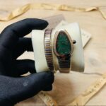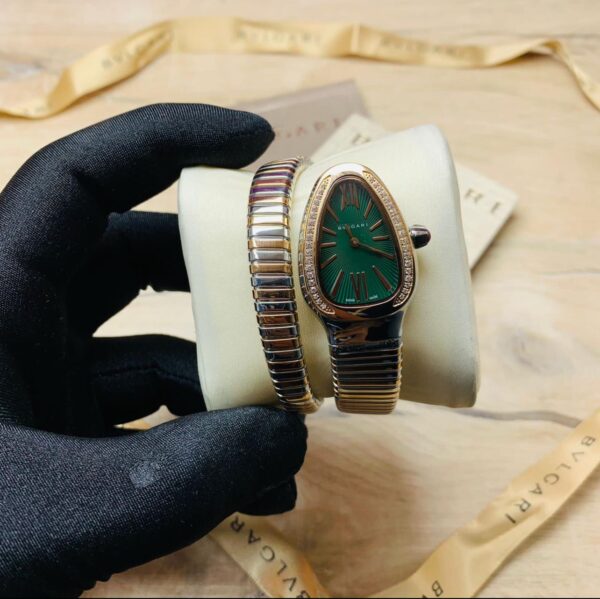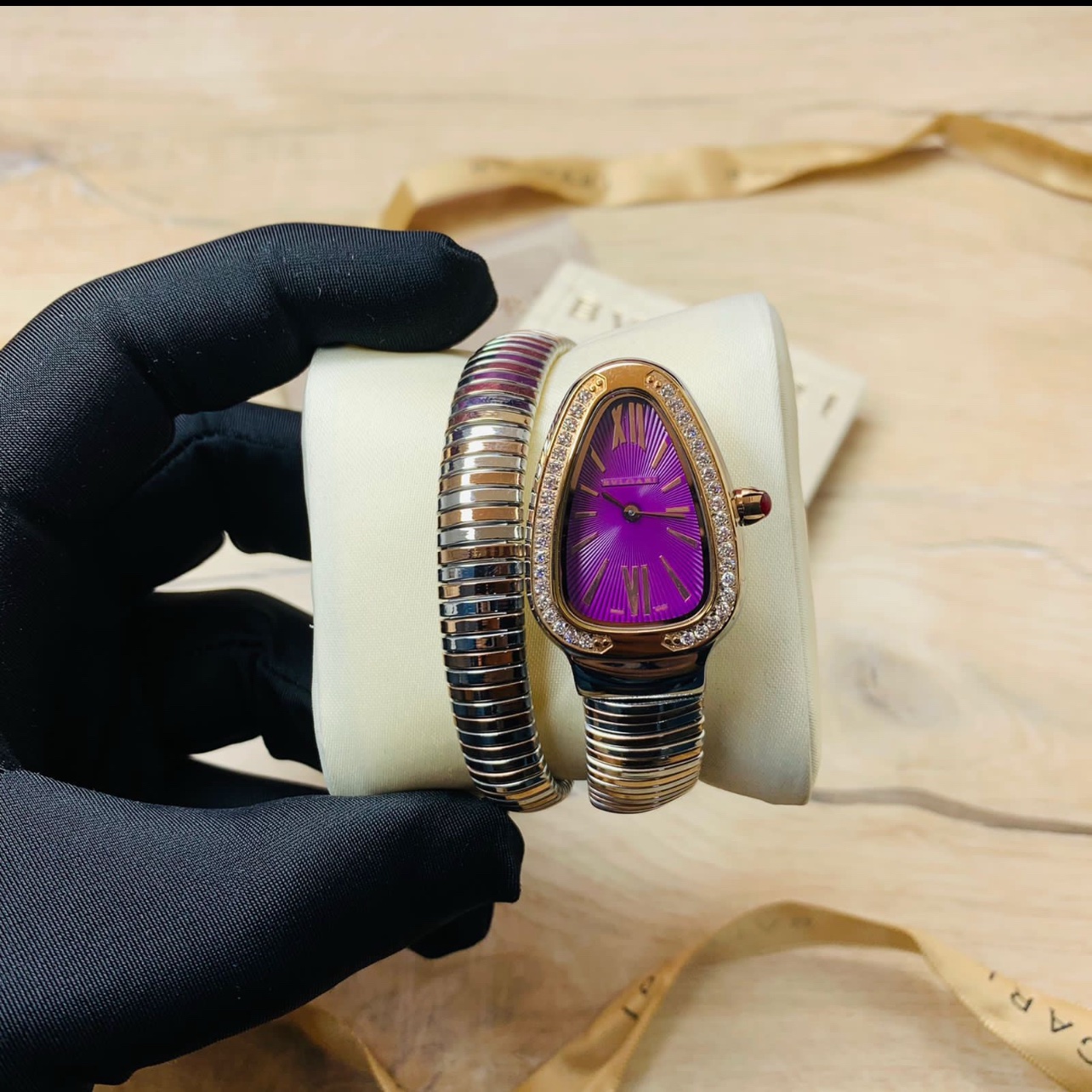 The Serpenti Tubogas watch by Bulgari, with a 33mm size, combines elegance and allure, reflecting the strength and beauty symbolized by its snake-inspired design. The strap is made from durable Stainless Steel 900 and features a distinctive shine that adds a touch of luxury. It is equipped with Sapphire glass that resists scratches and is also water-resistant, making it ideal for any occasion.