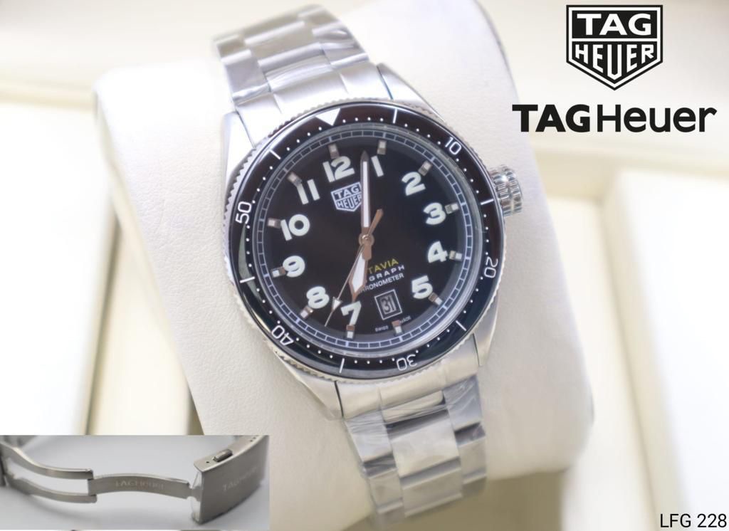 The sleek black dial is protected by sapphire crystal, and the stainless steel bezel enhances its overall refinement. The watch comes complete with all accessories, including a luxury box and pouch.