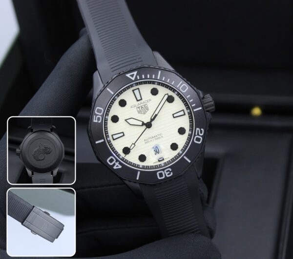 This replica watch combines strong performance with stylish design, making it an ideal choice for those who prefer the look of a TAG Heuer Aquaracer but at a more competitive price. The light olive green dial and blue-numbered bezel add a unique touch, ensuring the watch stands out as both a practical and stylish piece.