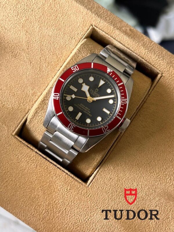 ساعة Tudor Black Bay 41mm تتميز بطوق من الألمنيوم أحادي الاتجاه باللون الأحمر الماروني، مما يمنحها مظهراً رياضياً وأنيقاً. على عكس النماذج الأخرى، لا تحتوي هذه الساعة على عقرب GMT أو ثلاث عقارب، بل تتميز بتصميم كلاسيكي بسيط بعقربين فقط.